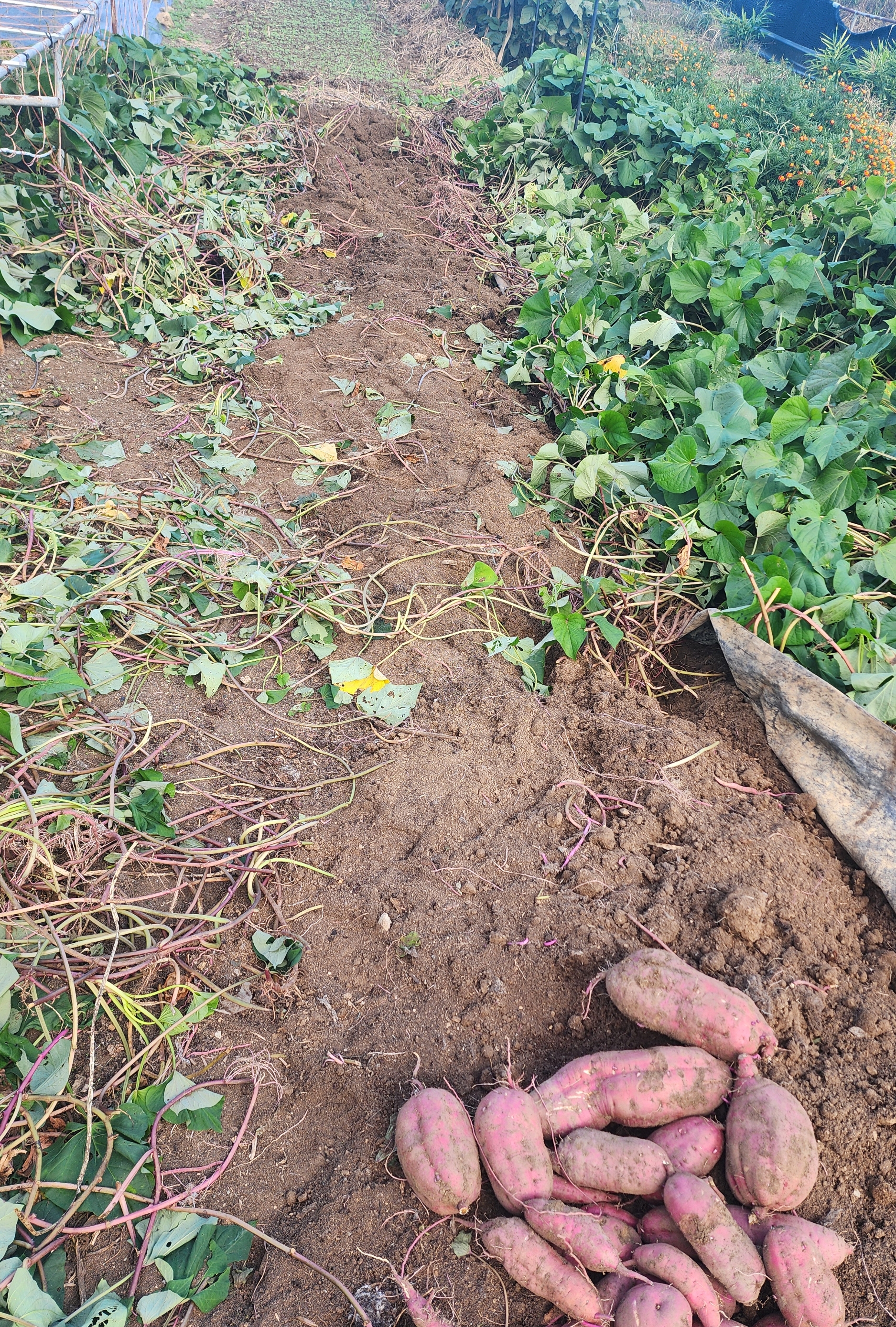 워낙 고구마 알이 안 들어서 내년에는 척박한 땅을 골라서 시범적으로 고구마를 심어보려고 했었는데 이번에 고구마를 수확하고 나니 그럴 필요는 없을 것 같다. 그래도 내년에는 거름기 적은 땅을 골라서 고구마를 심어야겠다. 고구마를 많이 먹는 것은 아니라서 사실 고구마 수확을 크게 기대했던 것은 아니지만 예상외의 수확이라서 그런지 다른 작물들을 수확할 때보다 확실히 더 기분이 좋다. 근데 그동안은 왜 고구마가 안 달렸을까? 답을 알 수 없는 궁금증이 늘어났다.