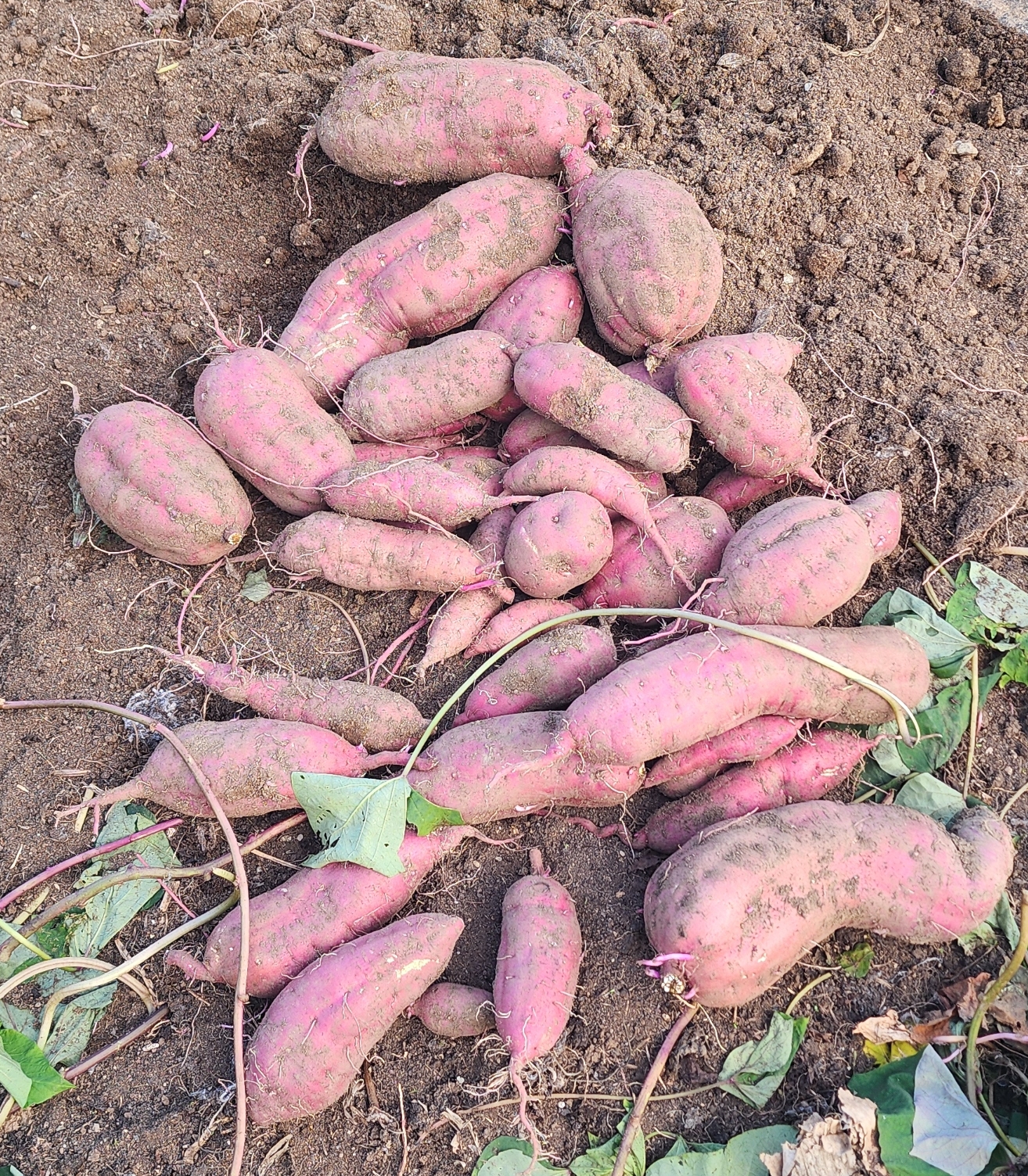 그제야 부랴부랴 다른 고구마의 뿌리 쪽도 파봤는데 많은 양은 아니지만 큼직하게 고구마가 몇 개 달려 있는 것이 보인다. 고구마 순을 따려고 왔다가 졸지에 고구마 수확을 하게 된 것이다.