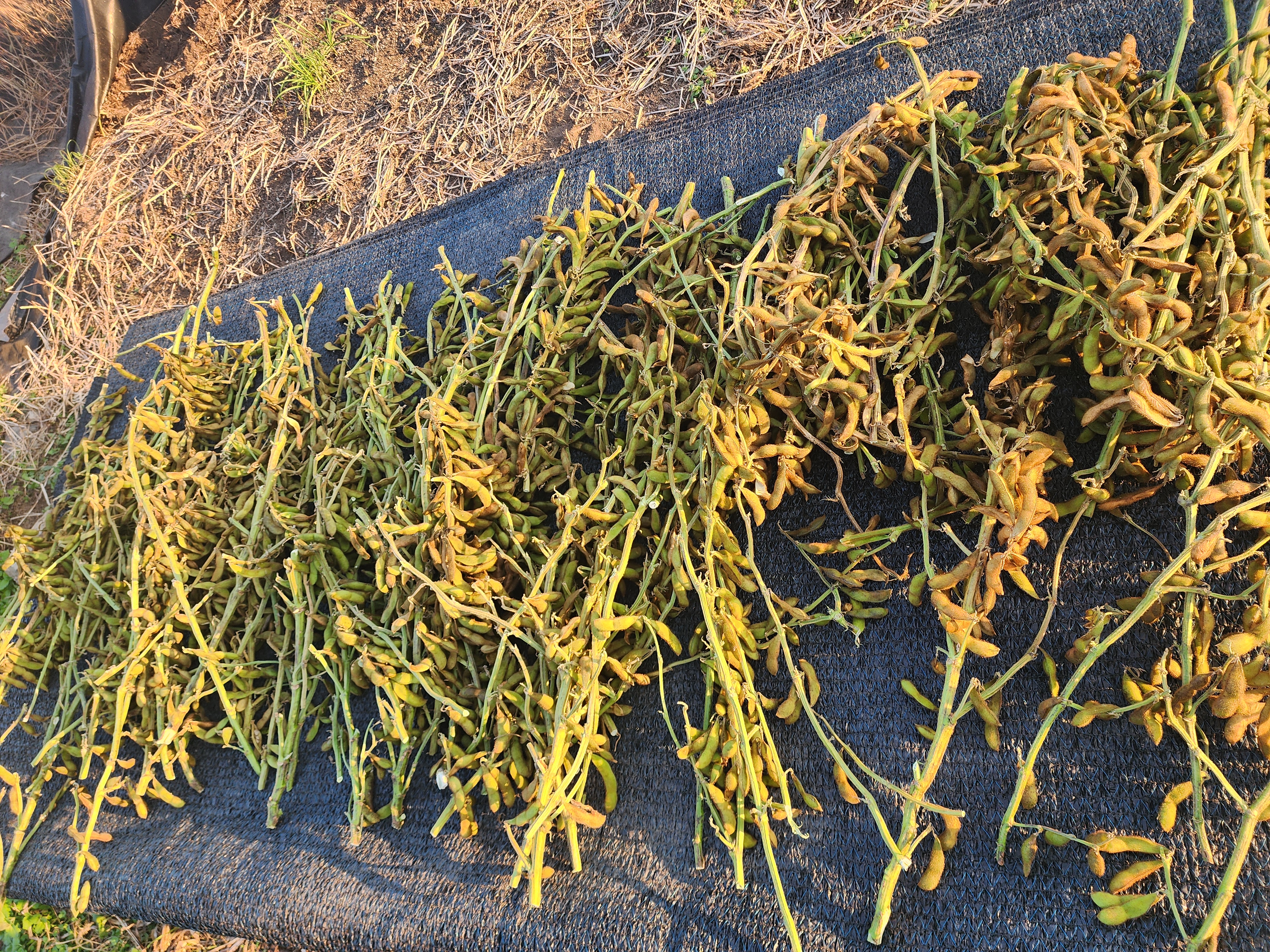 줄기를 벤 콩은 파렛트에 널어놓고 부직포를 씌워서 말린다. 동생의 이야기로는 그늘에서 말린 콩이 햇빛에서 말린 콩보다 상태가 좋은 것 같다고 했다. 이미 수확한 선비콩과 아주까리밤콩이 그랬기 때문이다.