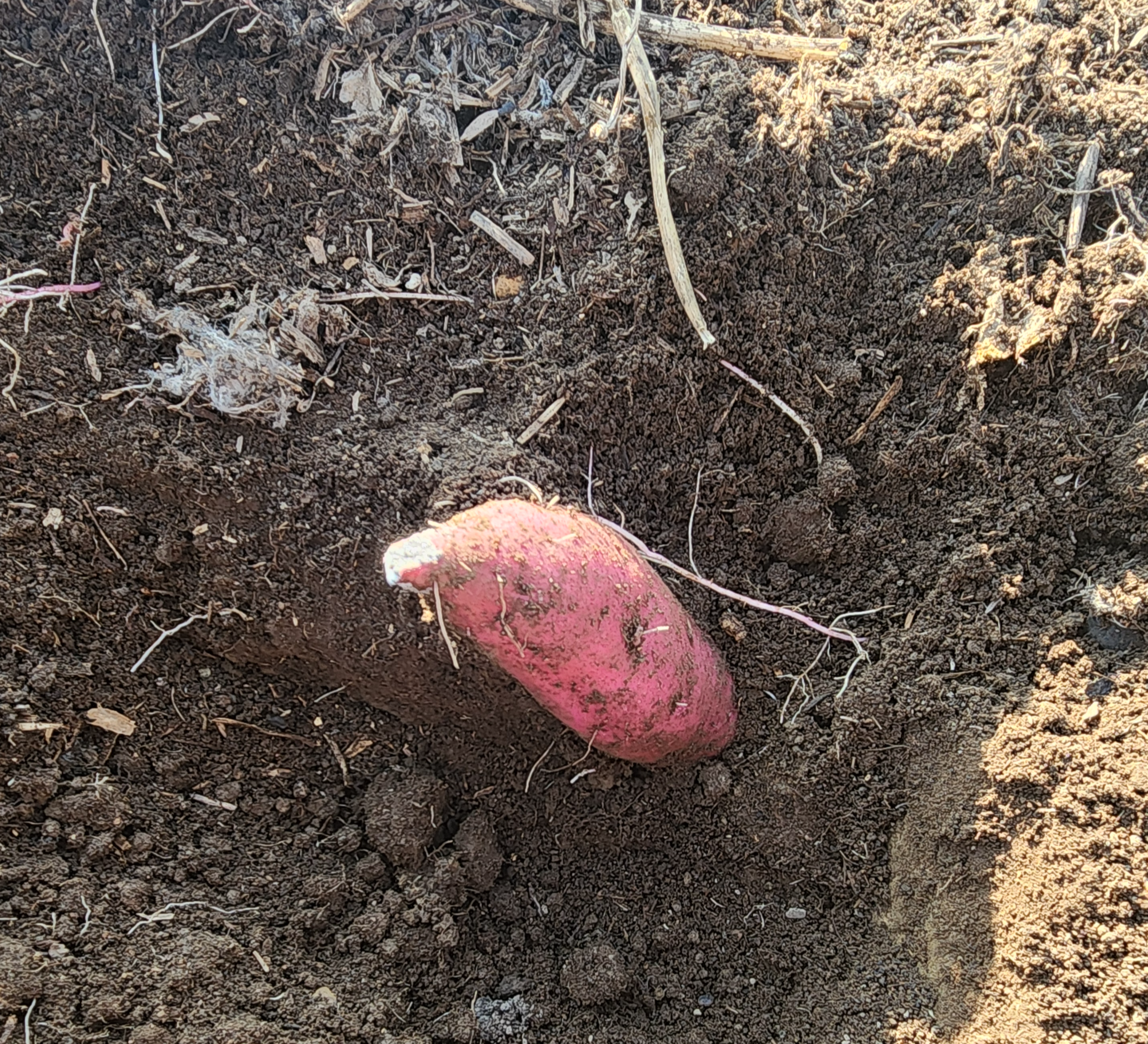 땅에 뿌리박은 고구마 줄기를 베어 끌어 모으다 보니 곁순이 뿌리박은 곳에 고구마가 달려 있는 것이 보인다. 고구마가 심겨있던 자리에서 1m나 떨어져 있는 자리니 이건 두말할 것도 없이 곁순이 박은 뿌리에서 생긴 고구마가 틀림없다.