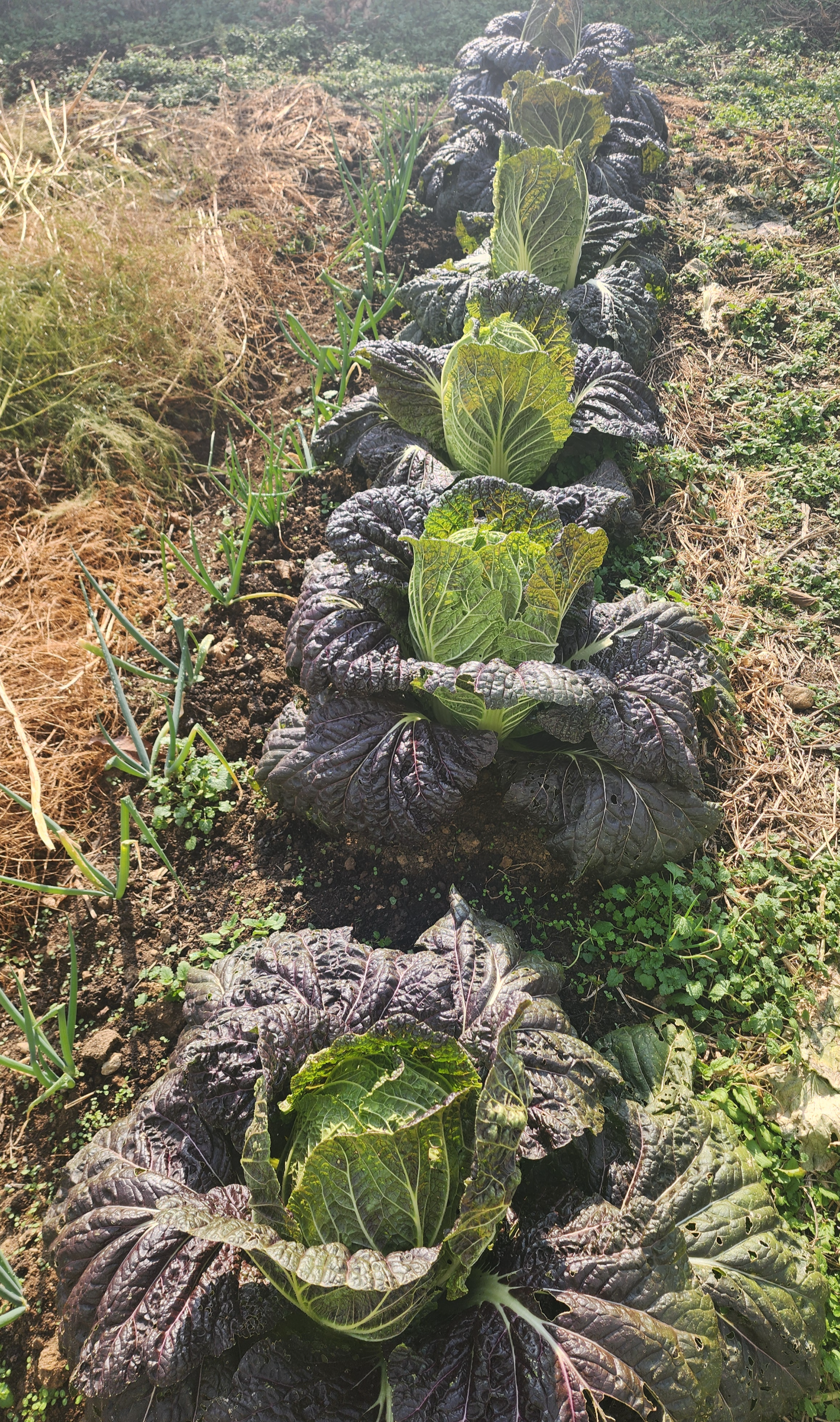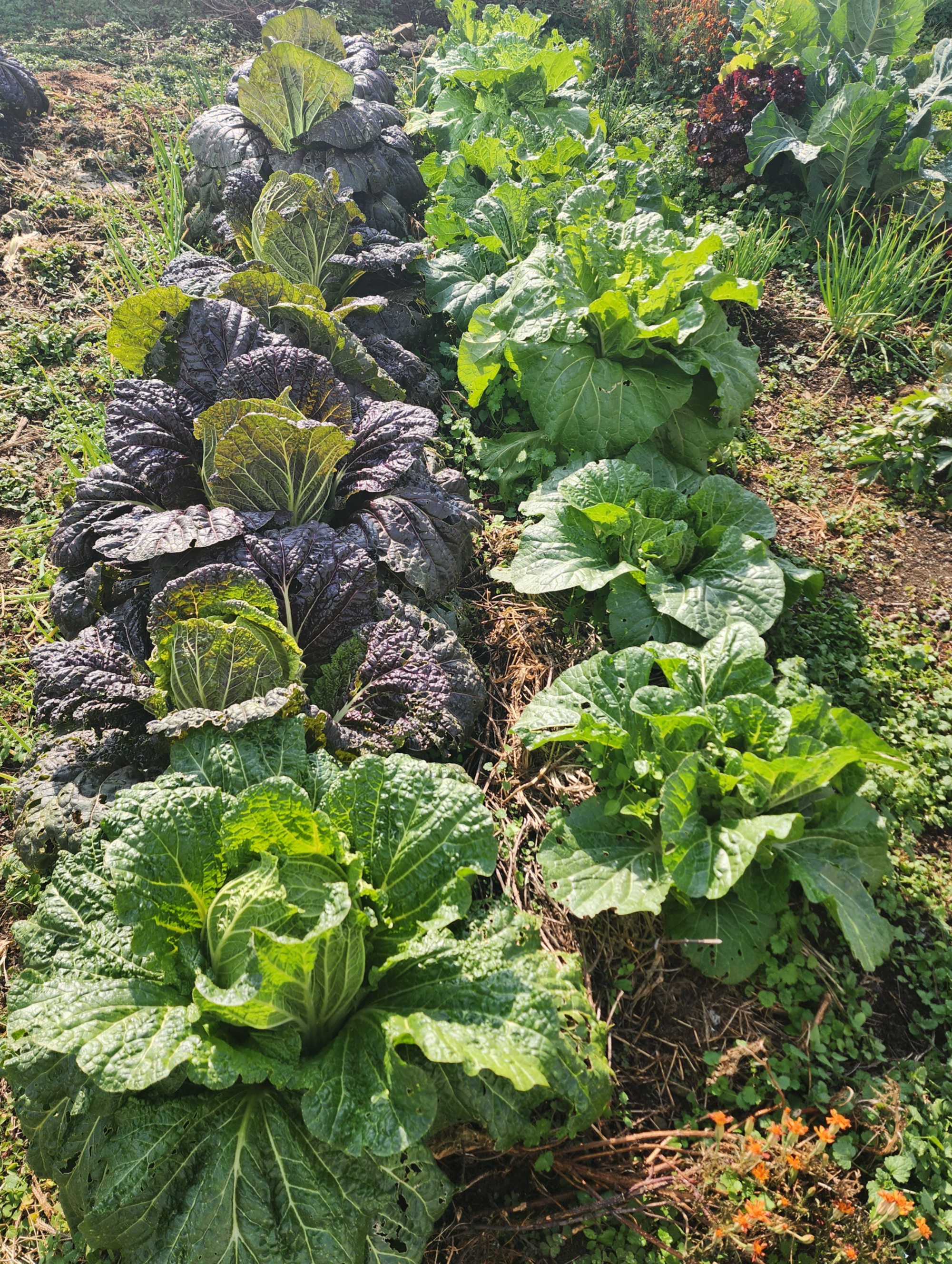 우리가 보기에는 토종배추나 덤으로 얻은 배추의 상태도 황금갓배추와 비슷비슷한 것 같다. 다만 토종배추는 좀 늦게 심어서 배추가 좀 작을 뿐이다. 토종배추는 청방배추와 150일 배추를 심었는데 두 배추가 섞여서 구분을 제대로 할 수 없는 데다 둘 다 결구배추이긴 하지만 늦게 심어서 그런지 결구가 안된 배추도 많다.