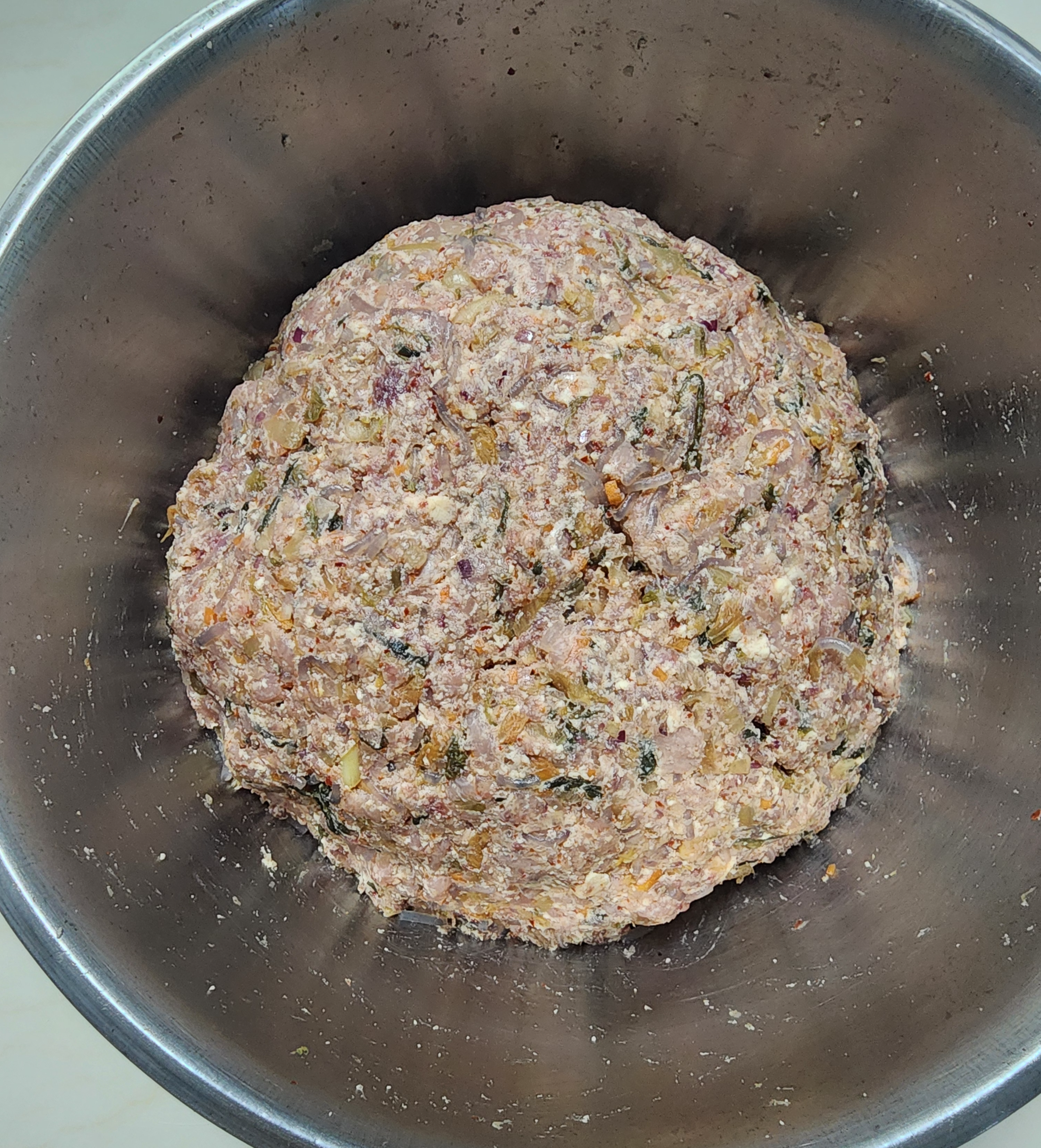 만두소를 만드는 재료는 다진 고기와 두부, 양파가 기본이고 취향에 따라 갖은 야채나 김치등을 추가하면 되는데 다양한 야채가 들어가면 만두의 풍미나 맛이 훨씬 좋아지기는 한다. 우리는 만두에 들어가는 고기를 돼지고기와 소고기를 2:1 분량으로 섞어서 사용한다. 돼지고기만으로 사용하면 탈이 잘 나고 소고기가 너무 많이 들어가면 만두가 퍽퍽하고 맛이 없기 때문이지만 취향에 따라 다를 수 있는 부분이라 취향껏 선택하면 된다. 돼지고기 400g, 소고기 200g, 두부 300g, 양파 1개, 김치 작은 포기 한 포기에, 냉장고에 남아 있던 자투리 무와 당근을 더해서 만두소를 만들었다. 다짐육만 사용하면 식감이 좋지 않기 때문에 돼지고기 일부를 잡채용으로 채 썰린 것으로 사서 듬성듬성 썰어 섞어주면 고기 씹는 맛을 제대로 느낄 수 있다. 준비한 고기는 참기름과 멸치액젓, 강황가루, 후추, 다진 마늘을 넣어 양념해 놓고, 당면은 물에 삶아 적당한 크기로 잘라서 준비한다. 나머지 야채들은 다 다져서 준비해야 하는데 찹퍼를 사용하면 크기도 균일하지 못하고 수분이 빨리 빠져서 재료의 맛이 떨어지기 때문에 만두소에 들어가는 모든 재료는 가능하면 칼로 손수 다져서 준비하는 것이 좋다. 김치와 양파, 무 등은 다진 후에 수분을 꽉 짜서 준비하고 당근이나 단호박같이 수분이 적은 채소는 다지기만 해서 준비한다. 양념한 고기에 물기를 꽉 짠 두부와 준비한 야채들을 모두 섞어서 고르게 섞이도록 잘 치대 준다.