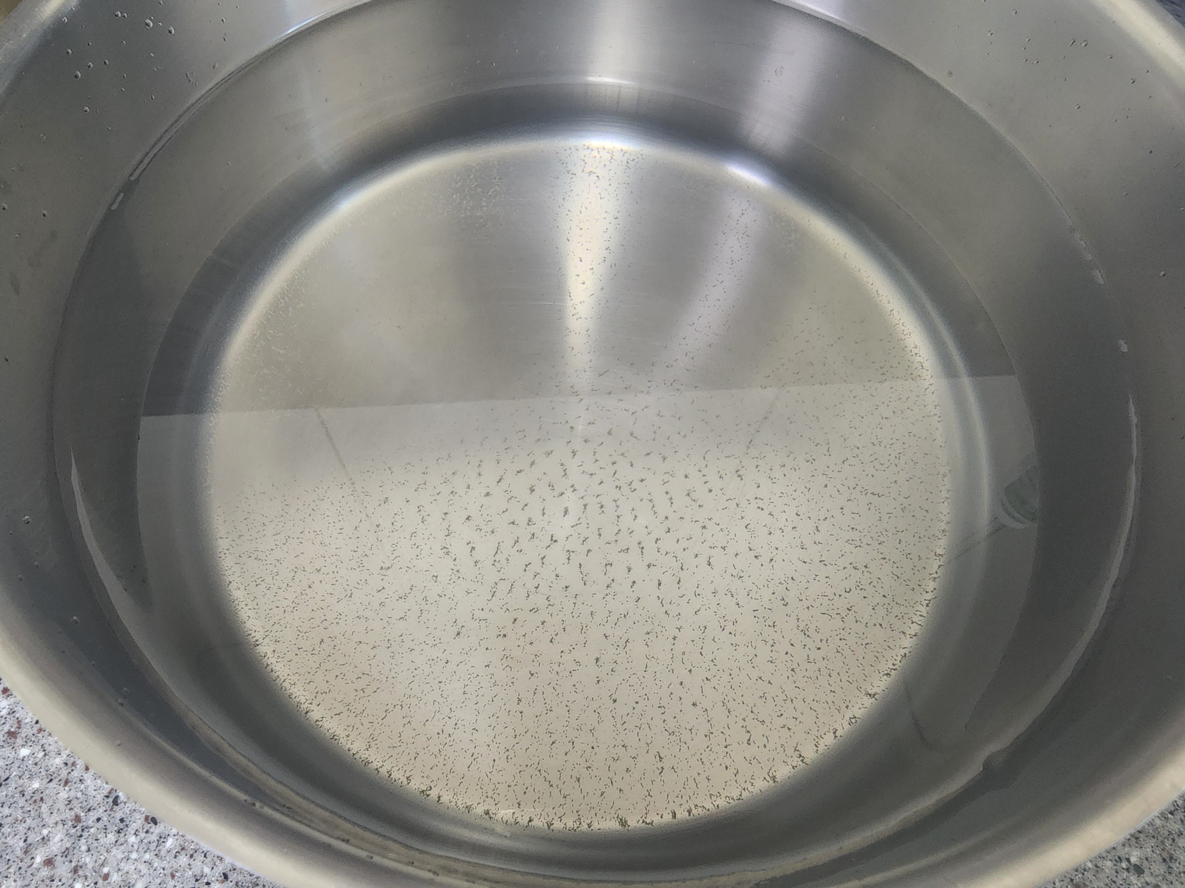 불순물과 잡균을 줄여 발효를 안정적으로 하기 위해 소금물은 끓여서 식혀 준비했다. 소금물의 염도는 아주 중요한데, 너무 낮으면 쉰내가 나고 너무 높으면 발효가 늦어진다. 적정 염도는 18~20%인데 우리는 물 6리터에 소금 1.32kg을 넣어 약 18% 염도로 맞췄다. 소금은 간수를 뺀 천일염을 사용하는 것이 좋은데, 우리는 토판염을 이용했다. 토판염을 끓여 식히니 미네랄 성분 때문에 물빛이 약간 탁해졌다.